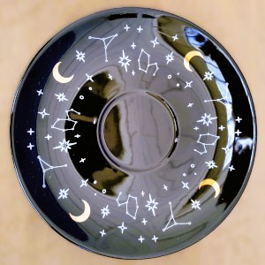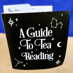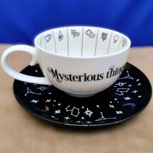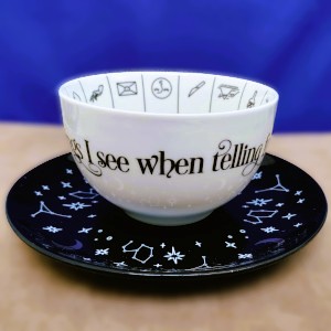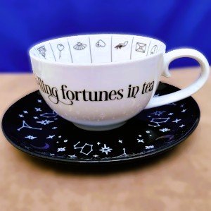 The white mug features astrological and fortune telling symbols in black with some gold accents and a contrasting black saucer with symbols in white. Around the outside, in black script, are the words: ‘Mysterious things I see when telling fortunes in tea’. Comes with an information leaflet. Treat yourself or someone you love.