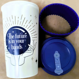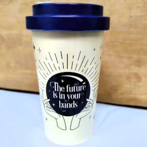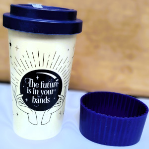 Be more eco-friendly when having drinks on the go. Made from durable bamboo fibre, this travel mug comes complete with lid and silicone sleeve to protect your hands. The lid has a stopper to prevent spills. Cream mug with ‘The future is in your hands’ in a blue crystal ball. Perfect for hot or cold drinks.
