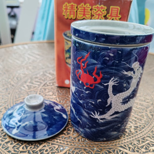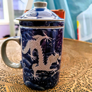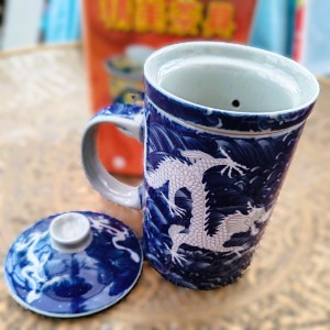 Lovely Chinese design mug complete with strainer to pop your tea leaves in and a lid to keep it warm while you wait.