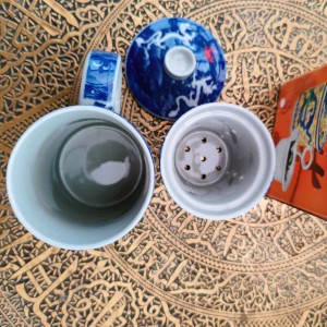 Chinese Tea Mug complete with infuser / filter and lid. An ingenious design of mug that has a separate infuser / filter which holds loose leaf tea to infuse gently in your mug. The lid fits over to keep it warm and keep all the flavour whilst infusing. Once the tea is brewed, simply take the infuser out, turn the lid over and it acts as a stand for the infuser to catch any drips. Ready to enjoy your tea!