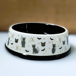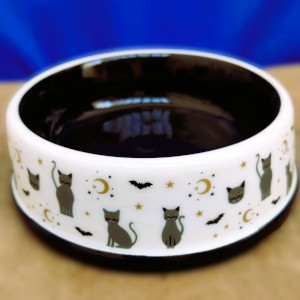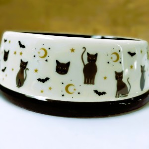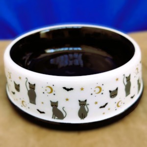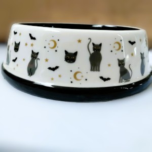 Attractive cat bowl in Gothicat design. Decorated with an enchanting cats and bats with mystical moons and stars with a shiny black interior, this ceramic food bowl will be a great gift for your furry friend. Treat your familiar companion to this gorgeous little dish.