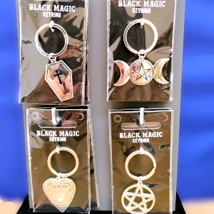 Metal gothic style keyring in tri moon design. The keyring is presented in a bag with black backing card with Black Magic written on it making it a great gift for the witches, wizards and goths in your life.