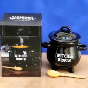 This super cauldron shaped soup bowl comes complete with a witches broom soup spoon and a lid to keep your soup warm and make it easier to carry without spilling. Shiny black with ‘Witches Broth’ in white, gothic style writing. Looks great on the table when you have guests over too.