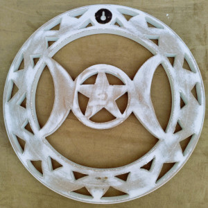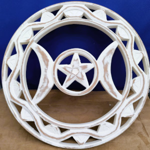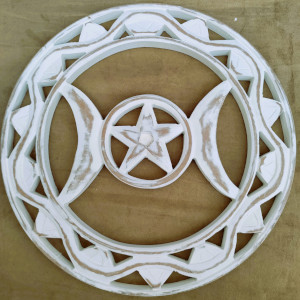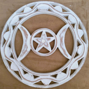 Wooden wall carving in a Wiccan Triple Moon design. The plaque has a white-wash finish to give a rustic look. The triple moon symbol sometimes known as the triple goddess symbol, is represented by two crescent moons flanking a full moon. These represent the Maiden, the Mother and the Crone – the three stages of a woman’s life.