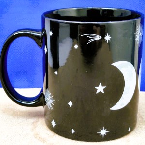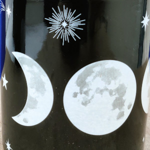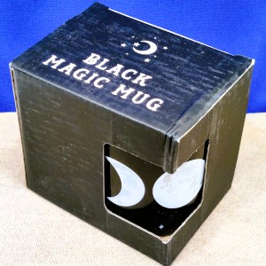 Lovely black mug with the Wiccan Triple Moon design in white running around it. The Triple Moon depicts the moon in its phases from new moon to full and back again. The waxing, full moon and waning moon is representative of the aspects of the Triple Goddess – the Maiden, the Mother and the Crone – the three stages of female life cycle.