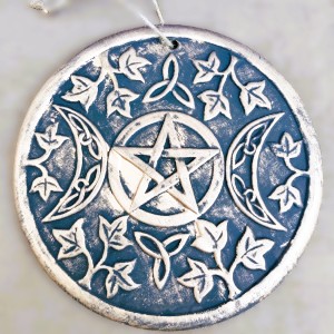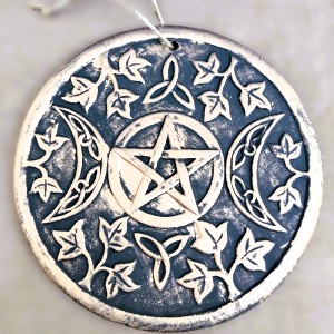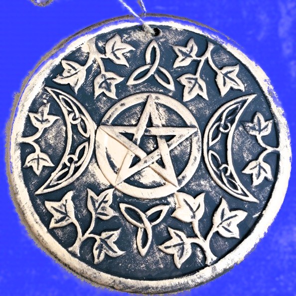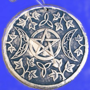 This wall hanging has intricate designs influenced by depictions of Celtic and nature surrounding the Wiccan Triple Moon. The Triple Moon is symbolic of the Triple Goddess and represents the Maiden, the Mother and the Crone. The moon phases are related to feminine energy and psychic ability. The plaque is made of terracotta with a copper effect finish. Ready to hand with a twine loop that completes a rustic look.