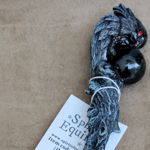 Add to your collection with this resin wand. Features a red-eyed raven perched over an inky, black sphere atop a twisting, moulded branch. The wand is a nice 24cm length and its curved shape gives it a lovely balance and feel when you are using it to cast spells or as a decorative piece. Perfect for any witch or wizard.